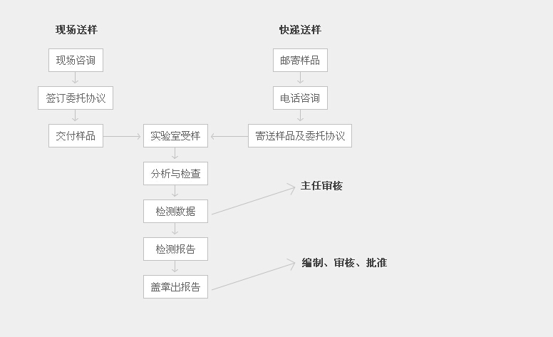 客戶委托公司檢測,可以采用現(xiàn)場送樣和郵寄樣品兩種方式,具體業(yè)務流程如下: